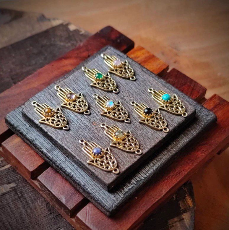 ⭐ Hamsa Hand Brass Connector with Natural Stone – Tribal Gold Tone Pendant for Micro Macrame Jewelry Making