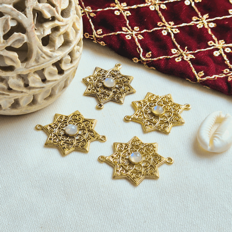 This beautifully detailed connector is crafted from solid brass and finished in a warm antique gold tone. The design features a multi-layered floral mandala pattern, combining geometric outlines with delicate petal-like elements radiating around a round natural stone centerpiece. The symmetrical, ornate structure gives the piece a rich decorative presence, making it perfect as a focal element in micro macrame and handmade jewelry.