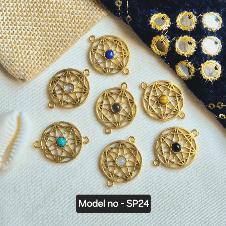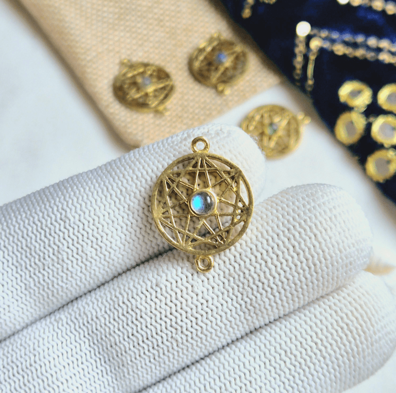 This finely detailed connector is crafted from solid brass and finished in a warm antique gold tone. The design features a circular frame with a sacred geometry star mandala pattern, highlighted by a natural stone set at the center. The symmetrical geometric lines create a balanced and spiritual aesthetic, inspired by sacred patterns found in traditional and contemporary jewelry. Its compact size and dual loops make it ideal as a centerpiece for micro macrame and other handcrafted jewelry designs.