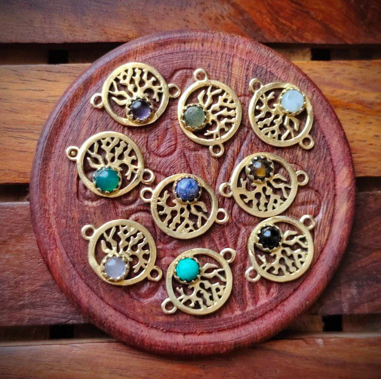 ⭐ Tree of Life Brass Connector with Natural Stone – Tribal Gold Tone Pendant for Micro Macrame Jewelry Making